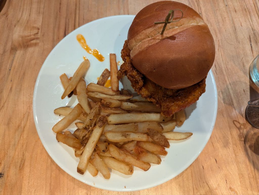 I ordered the Grilled Cheese (this was an adult grilled cheese, thank you, complete with apples, caramelized onions, and bacon jam), and Nick ordered the Carolina Hot Crispy Chicken Sandwich. We also ordered fries and sweet potato fries.