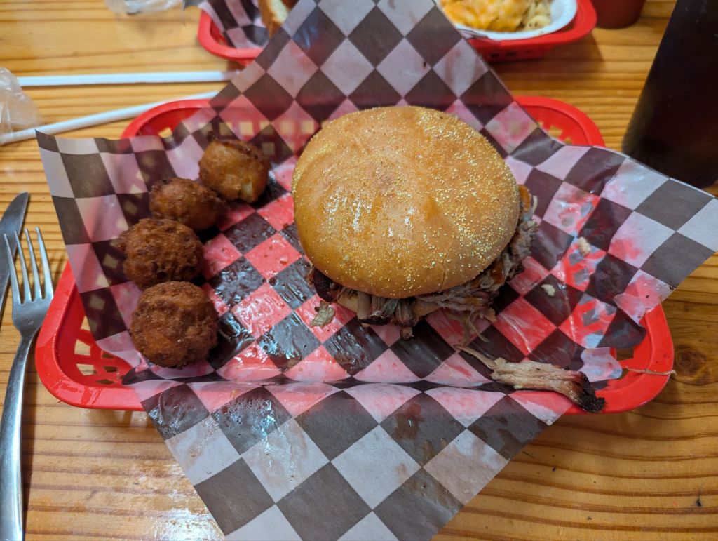 I ordered the pulled pork sandwich and hush puppies while Nick–daring parking lot guy to be wrong–ordered the brisket dinner with baked mac & cheese and baked apples.